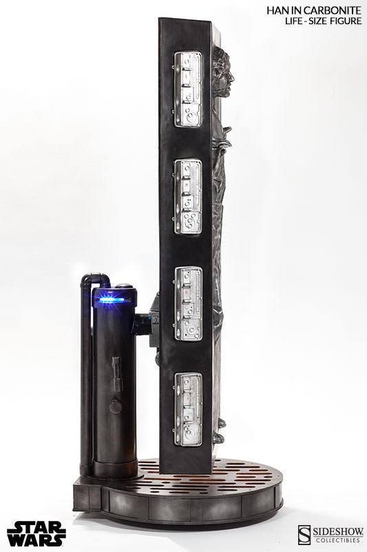 Sideshow presenta un`impressionante figura life-size di Han Solo nella carbonite! La statua è perfetta in ogni dettaglio, è del tutto identica a quella vista nella saga di Guerre Stellari. Sulla base e sul fianco sono presenti delle luci. Per veri appassionati di Guerre Stellari!